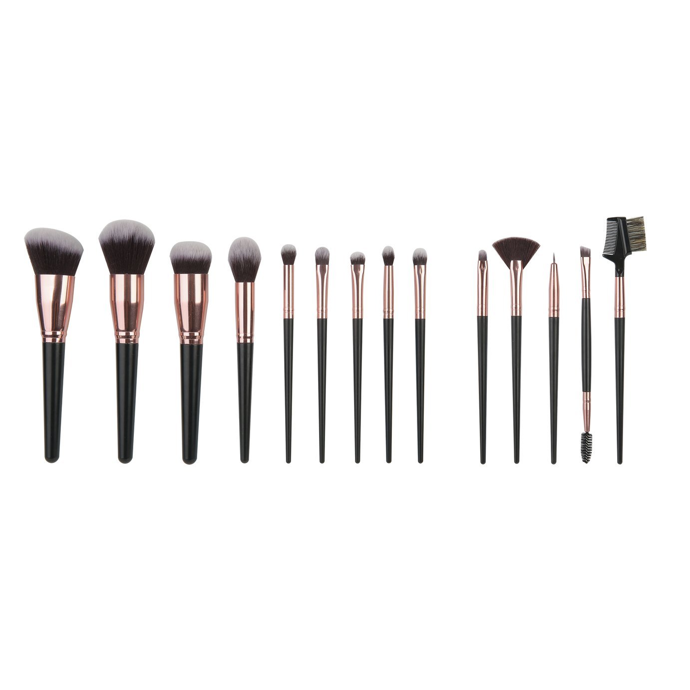 Soft and silky. This 15pc makeup brush set is the real deal. Ideal for professional or home use. Included are all the must-have brushes for blending, buffing, contouring, shading and highlighting. Plus, there are eye shadow, eyebrow, lip, concealer and foundation brushes too. Each brush has a sleek black and rose gold design with premium bristles, for a luxurious touch to your makeup routine. Achieve a fabulous, flawless finish in no time. . Comes with a handy black carry case to keep them good as new. Take it to work, on your holidays or a night out on the town.; Need some new products to use with your brushes? Check out our range of makeup options.; Includes Powder brush Angled contour brush Foundation brush Highlight brush Eyeshadow brush Eyeshadow brush Eyeshadow brush Eyeshadow brush Angled eyeshadow brush Blending brush Concealer brush Fan brush Eyeliner brush Angled brow and eyelash brush Eyebrow brush.; Travel size.; For ages 8 year and over.